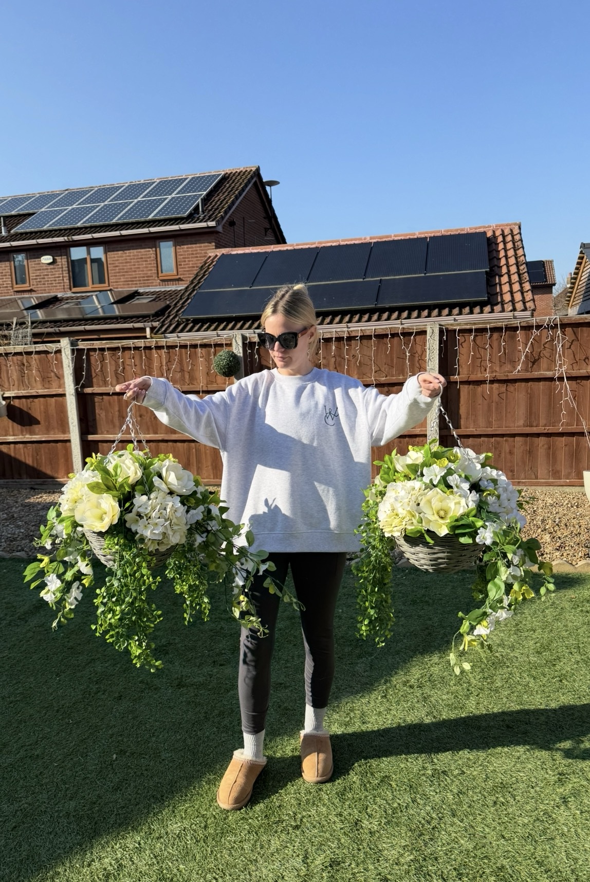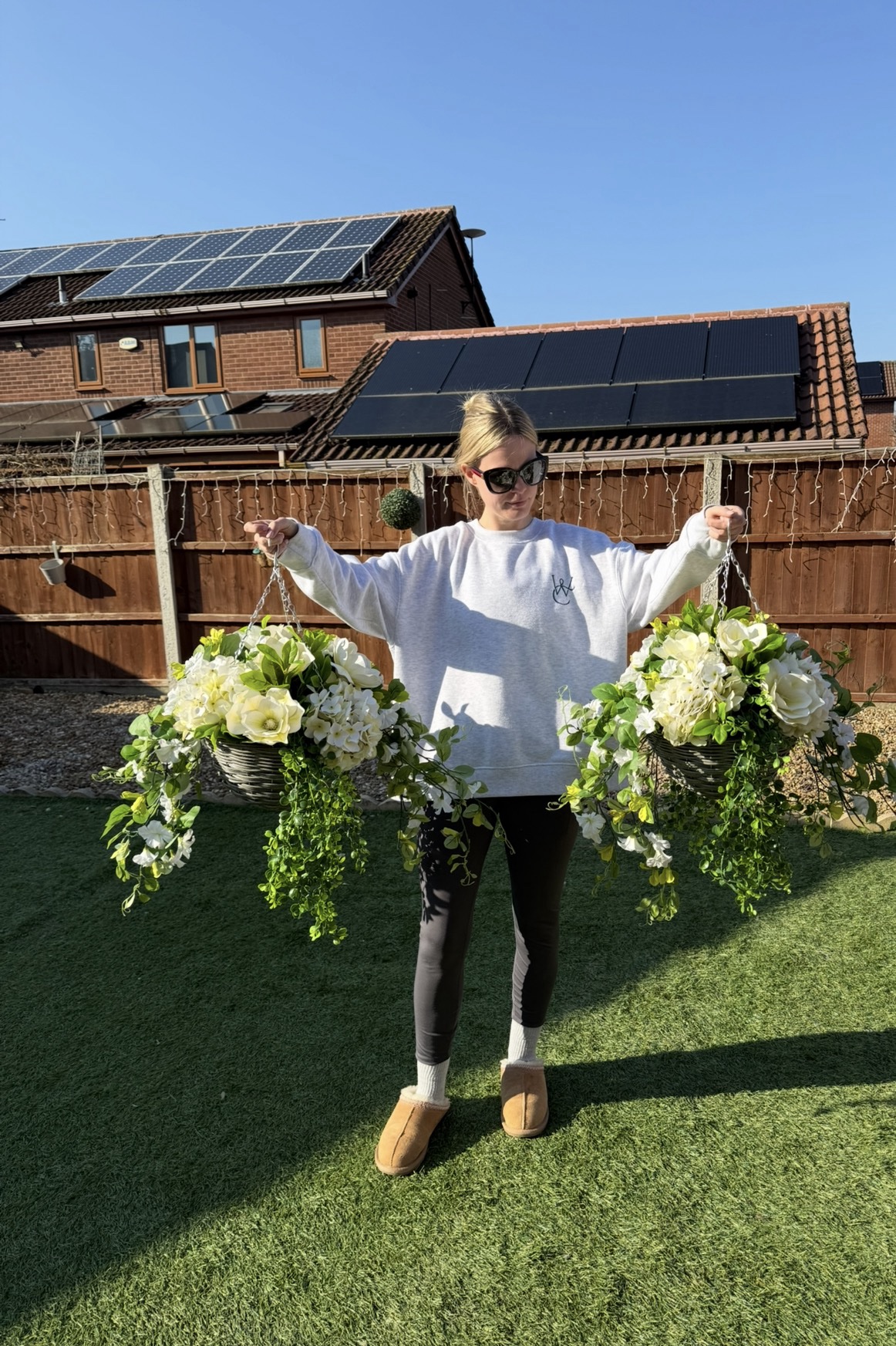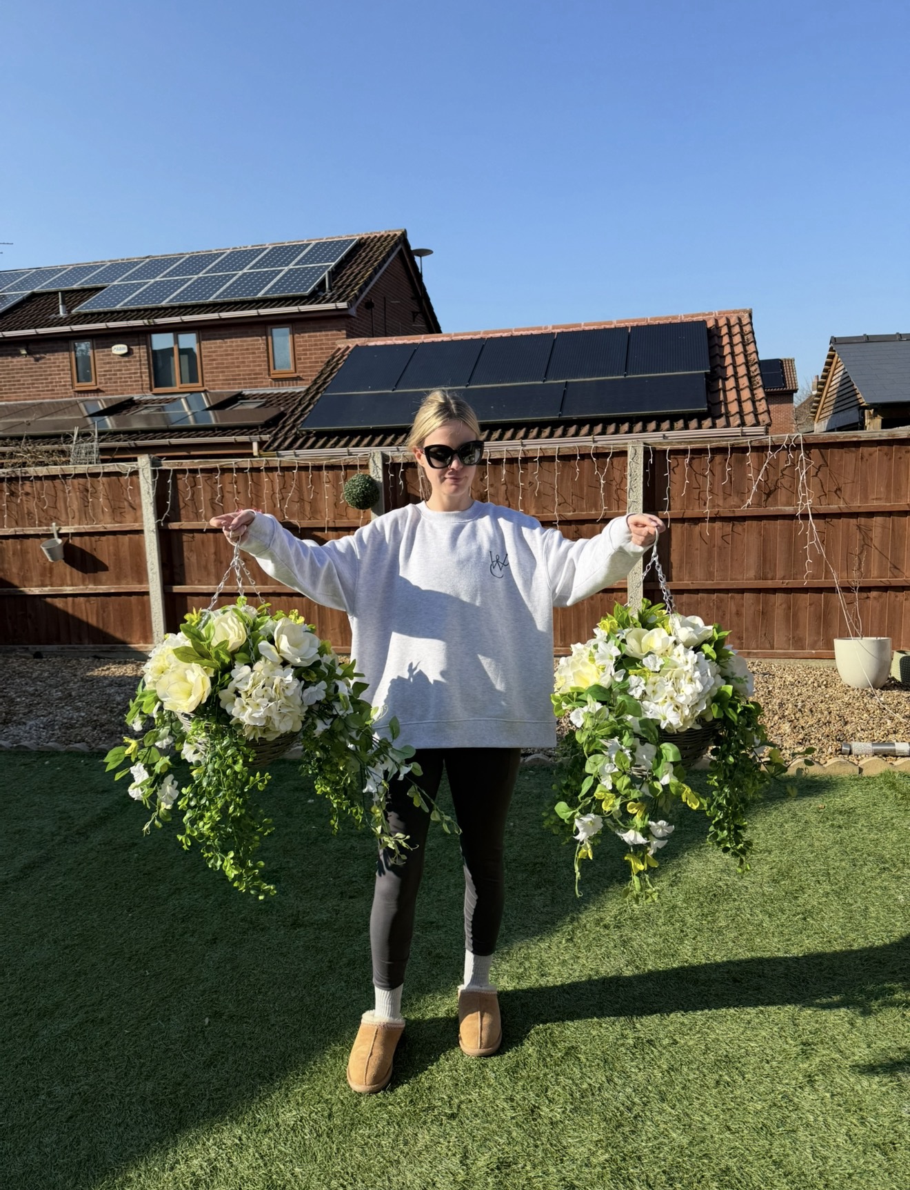 Two matching hanging baskets with faux ivory hydrangeas and magnolias along with green foliage. Grey wicker style baskets. They are not weighted.