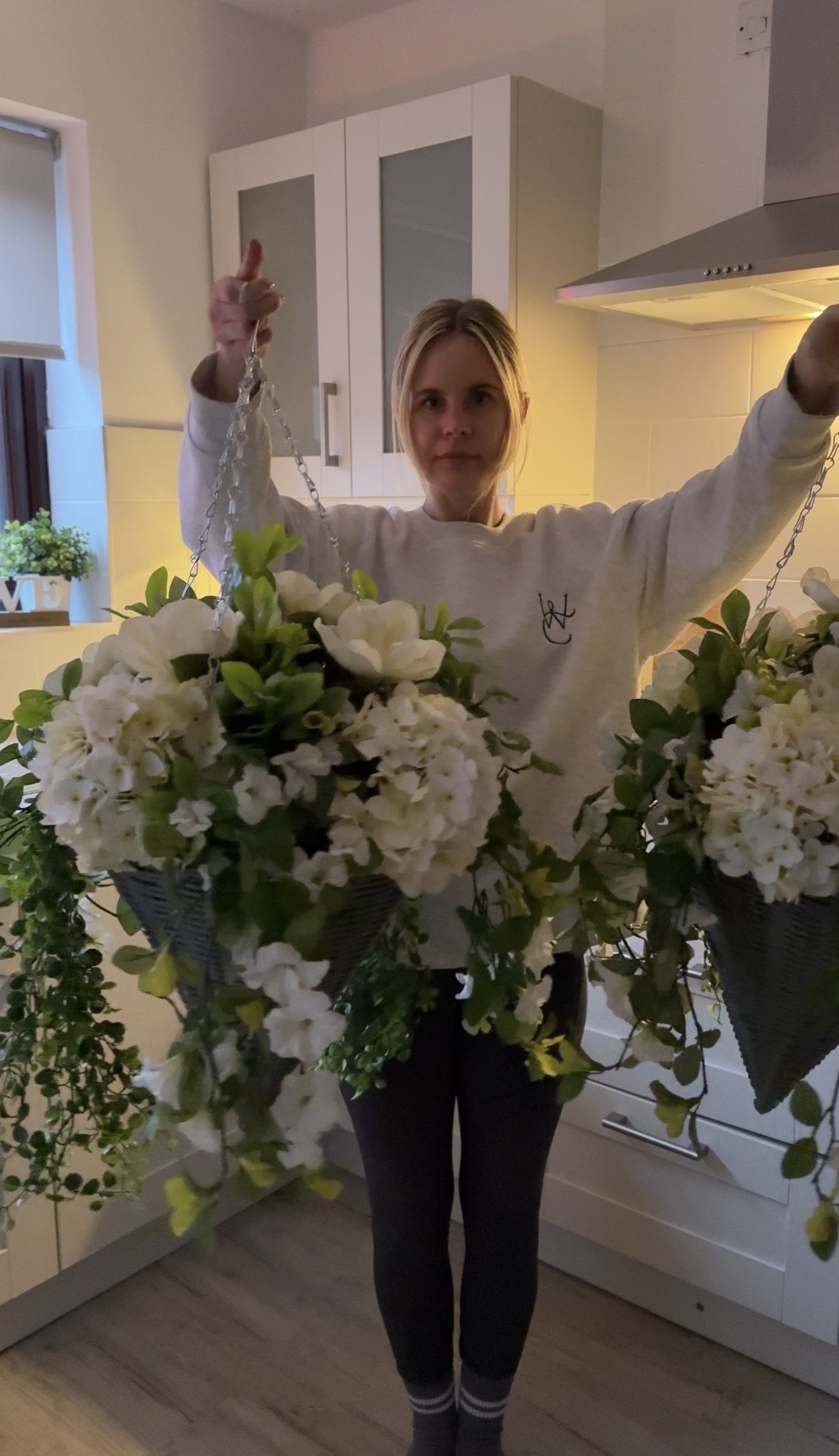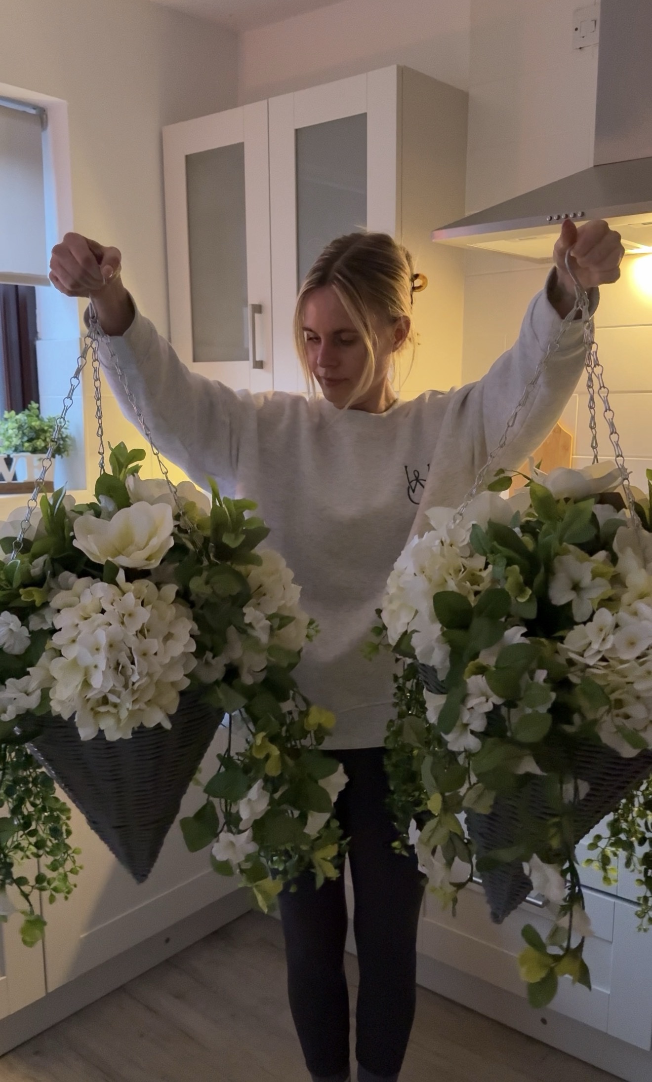 Two matching hanging baskets with faux ivory hydrangeas and magnolias along with green foliage. Grey cone style baskets.