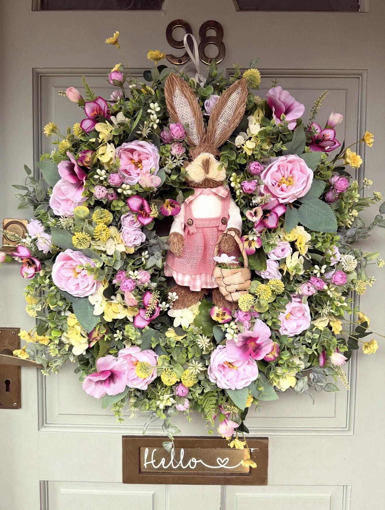 A large faux Easter Spring wreath with the most beautiful wicker style bunny in the centre. A real eye-catcher for your door.