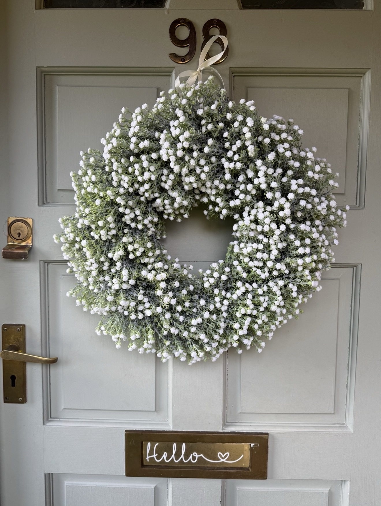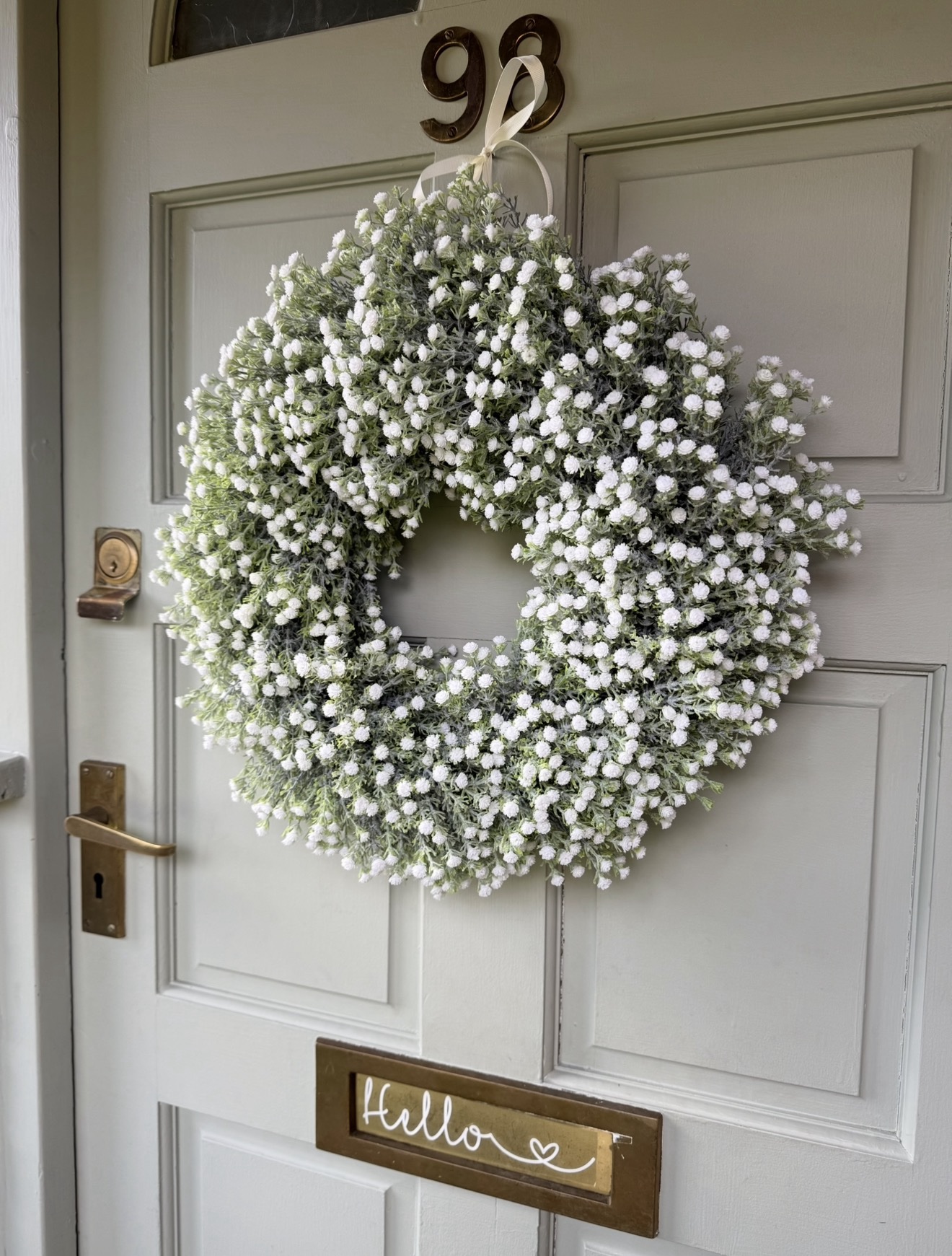 Faux gypsophila wreath on a grapevine base, approximately 40cm diameter.