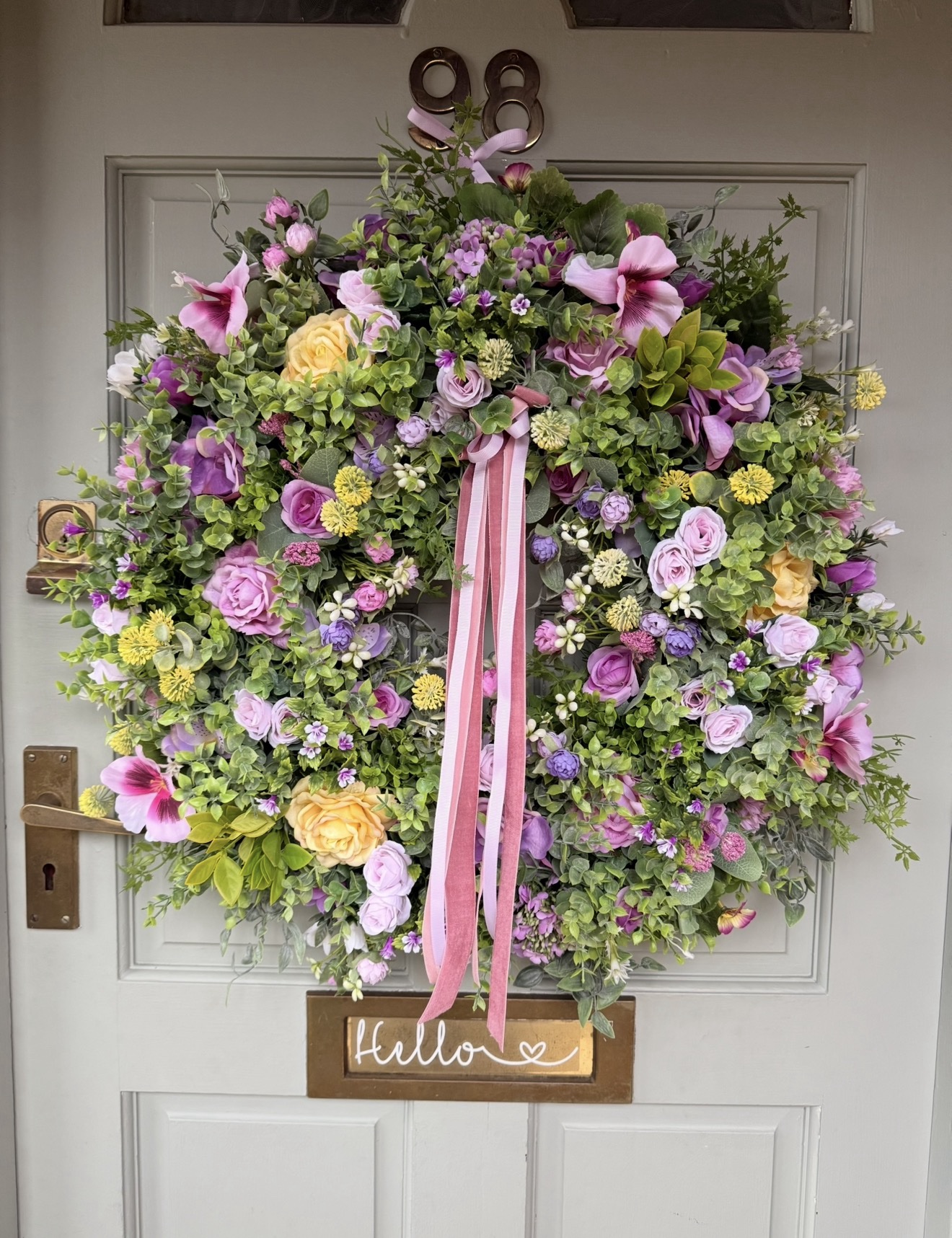 A large faux Spring style wreath, approximately 65cm diameter.