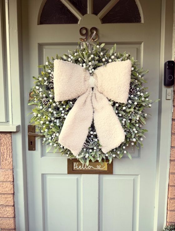 Faux Christmas wreath with an extra large boucle style bow