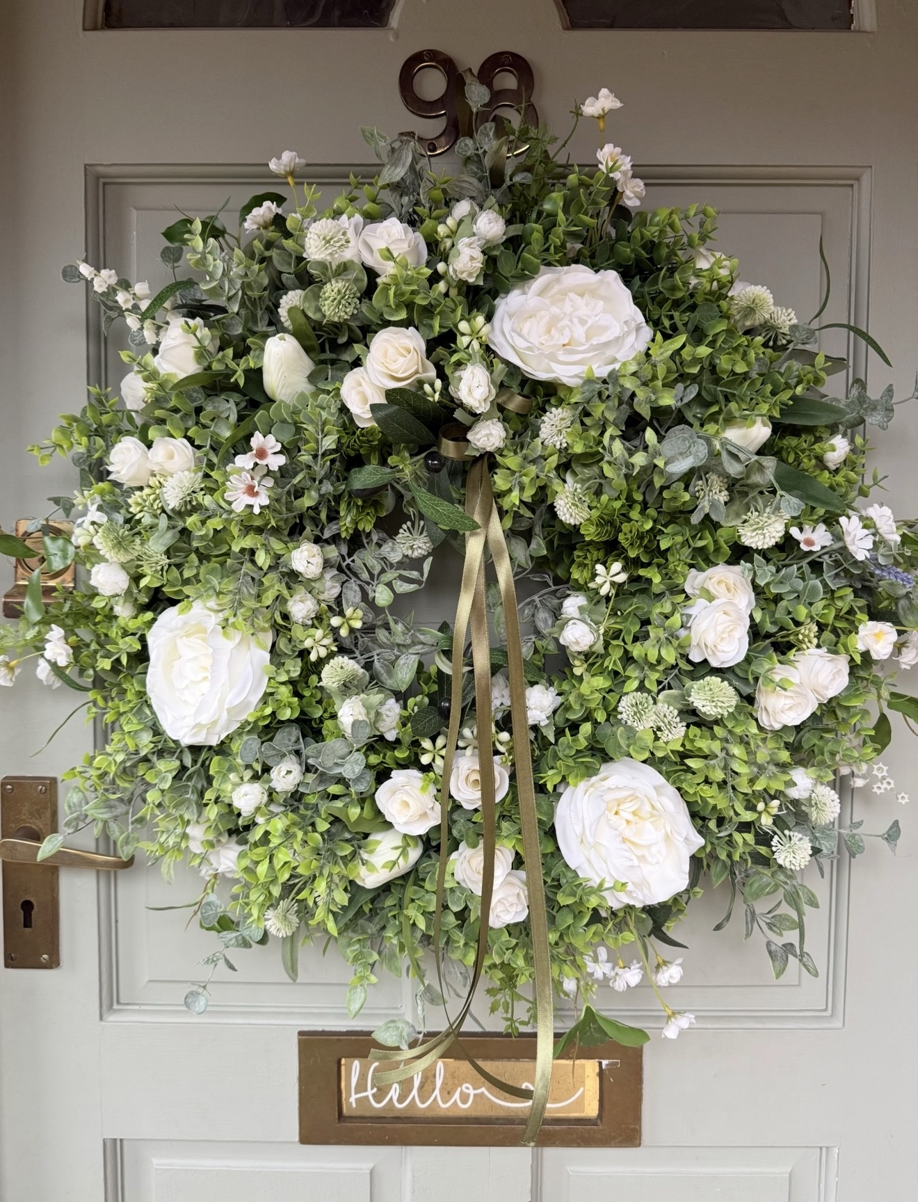 A large faux Spring style wreath with added faux olive branches, approximately 65cm diameter.
