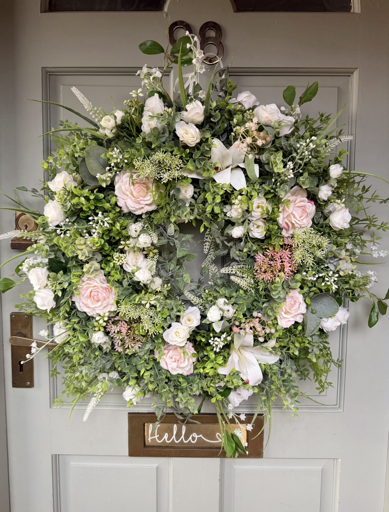 A large faux Spring style wreath with added Lilys, approximately 65cm diameter.
